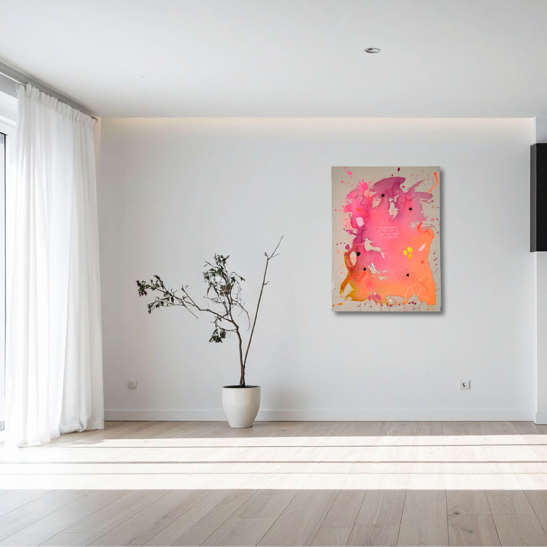 Die Leinwand habe ich selbst gebaut und mit hochwertigem Baumwollgewebe von Hand bespannt. Durch das großzügige Format 50×70 cm und die 4 cm Tiefe wirkt das Werk präsent, modern und kraftvoll. Die schwarzen Akzente am Rand geben dem Bild einen edgy Look und ersetzen bewusst einen klassischen Rahmen.