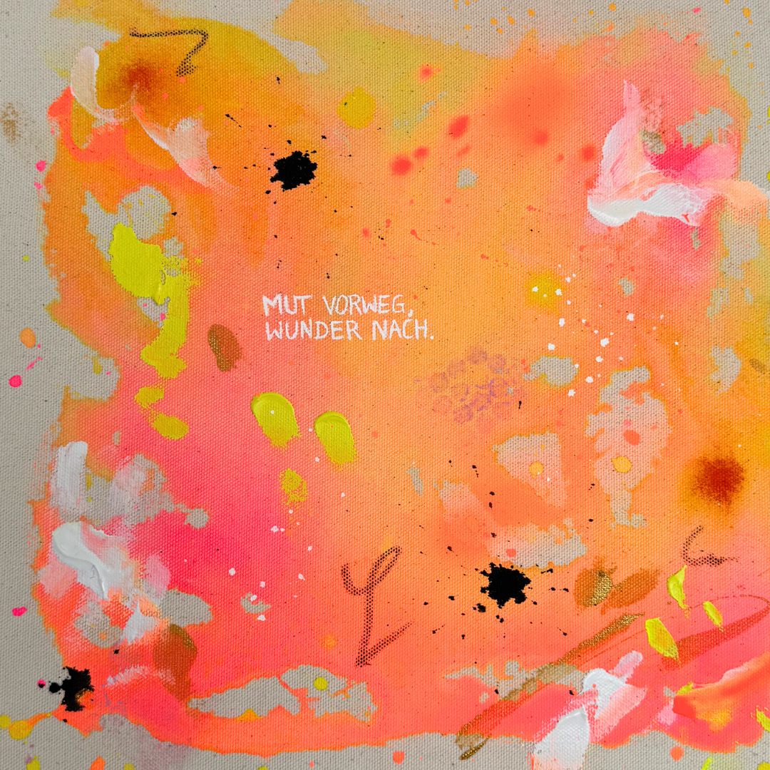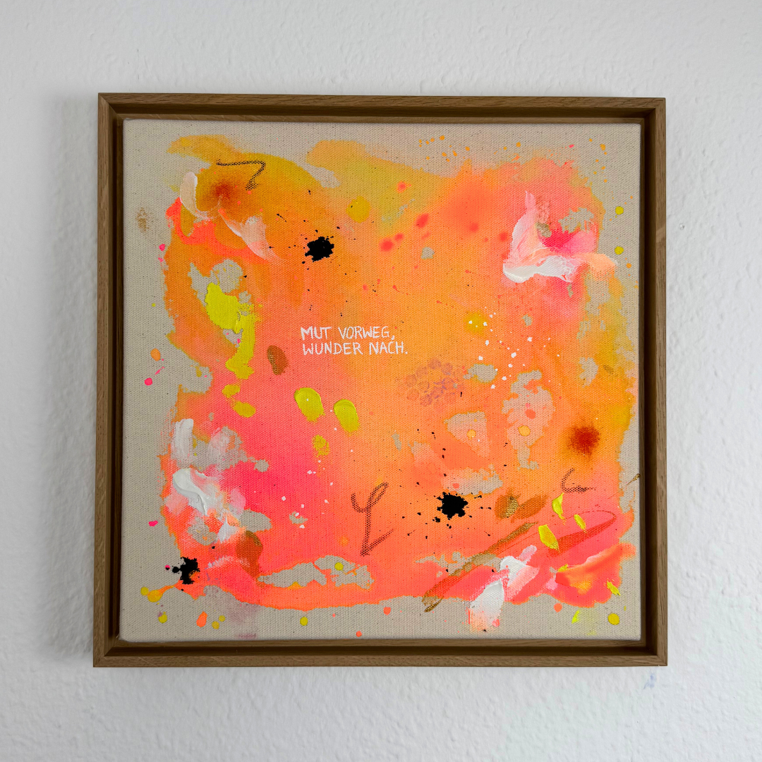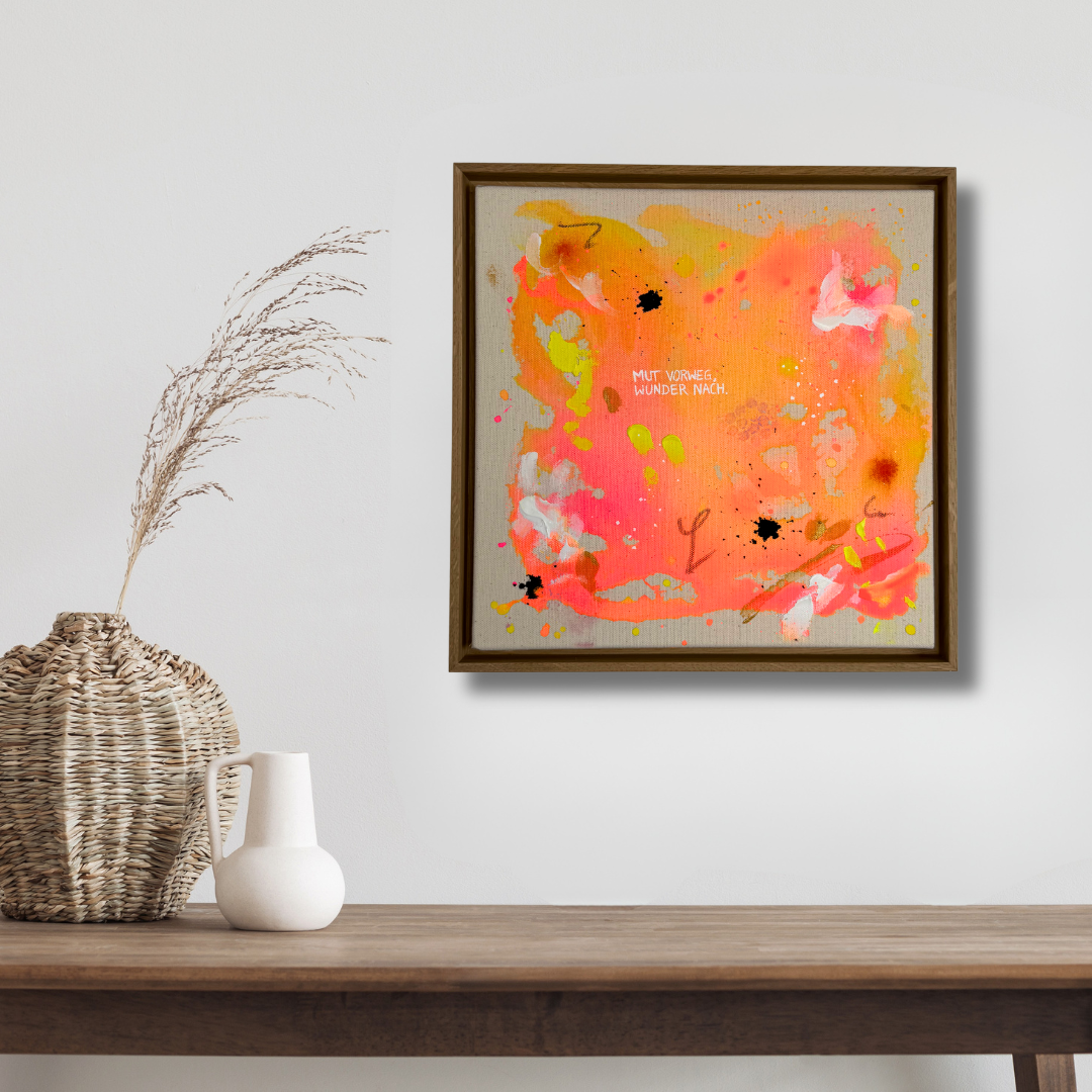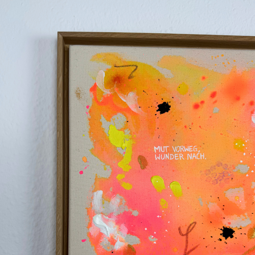 Die warmen Neon-Orange- und Gelbtöne bringen sofort gute Energie in den Raum, während die freien Spritzer und weichen Übergänge dieses Gefühl von „einfach losgehen“ transportieren. Der Eichen-Schattenfugenrahmen gibt dem farbintensiven Motiv einen modernen, ruhigen Rahmen.